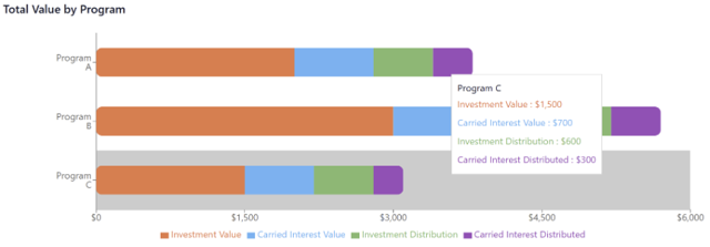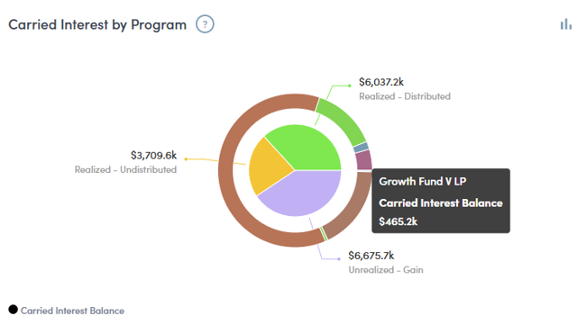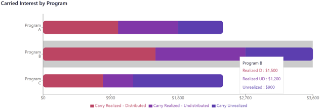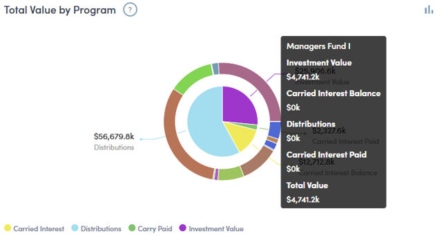 An overview of a Partner’s carried interest organized by fund. Available as both a bar and pie chart.